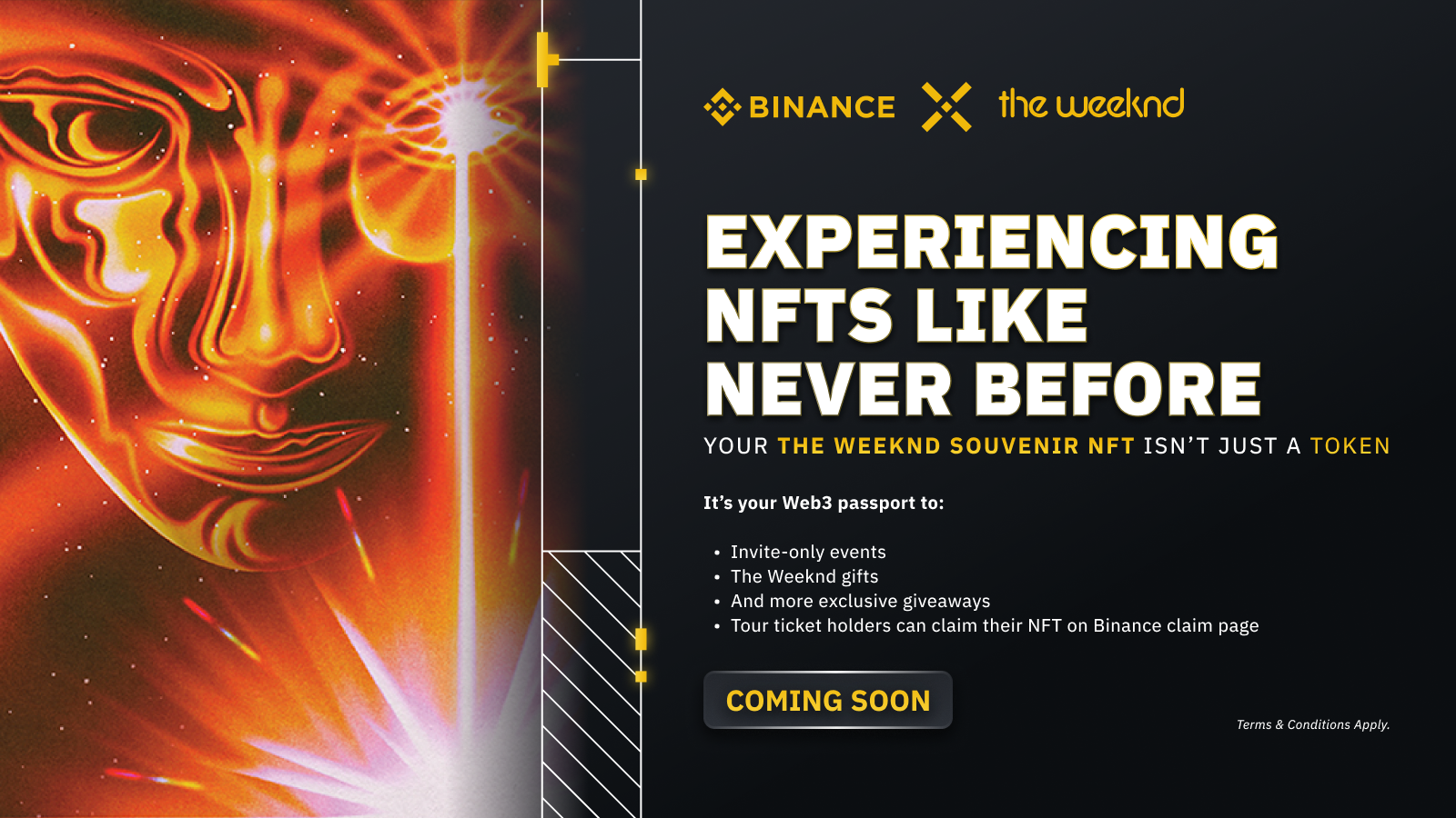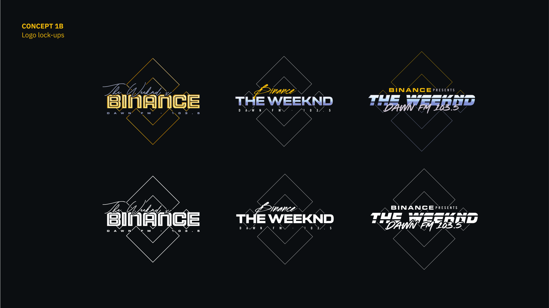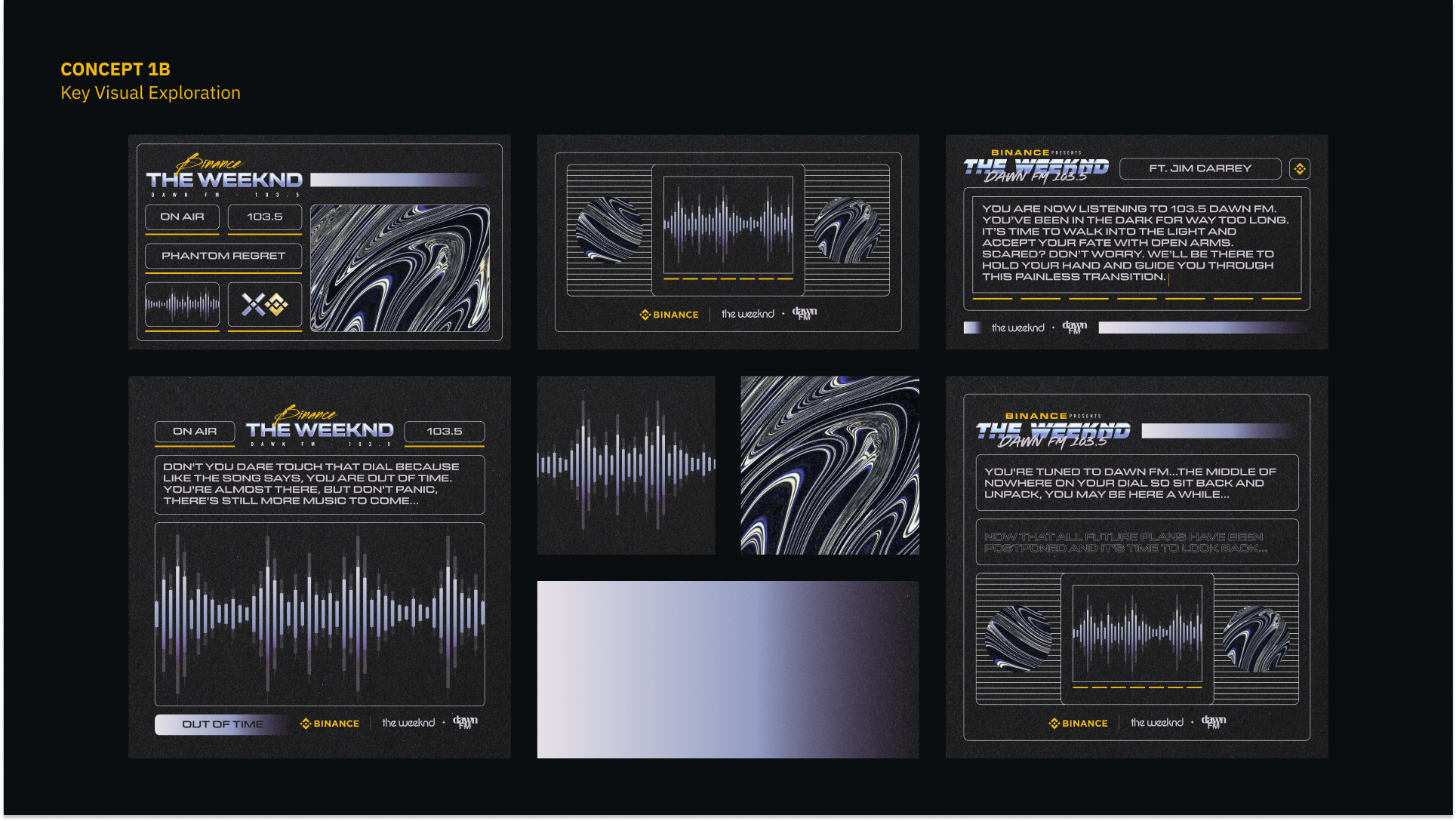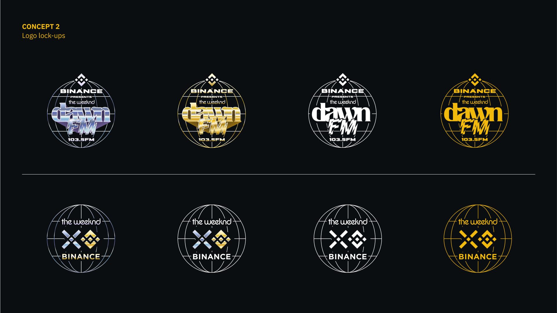 As Binance embarked on a sponsorship for The Weeknd’s Dawn FM tour, we explored two main directions for the key visuals for the partnership, reflecting two main themes of the album – one emulated the stylistic sensibilities of a retro-futuristc radio DJ, and another as a mash-up of the original and remake of Tron, playing with the idea of using light as a core graphic element. These visuals will be applied across partnership visuals, tour merch, and digital campaigns. Final artwork currently unreleased and remains private and confidential.
